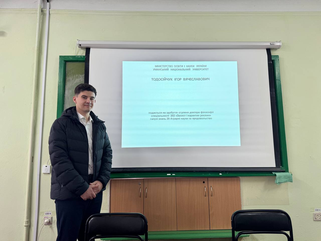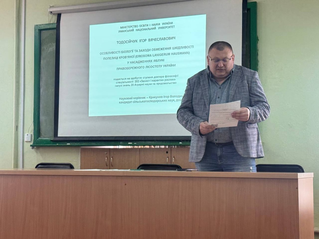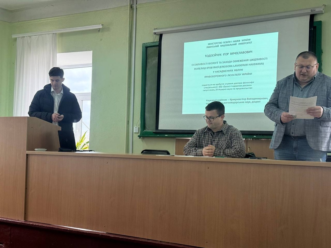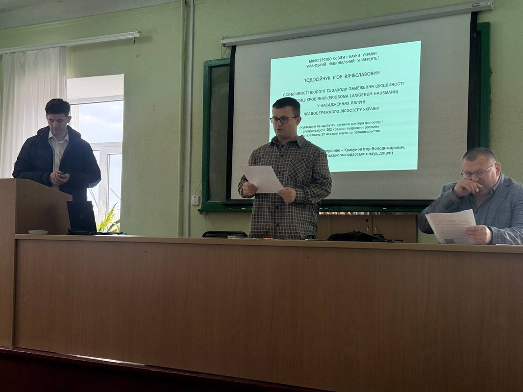 23 квітня 2026 року на кафедрі захисту і карантину рослин факультету біоресурсів і природокористування відбулась публічна презентація наукових результатів дисертаційної роботи аспіранта кафедри захисту і карантину рослин Тодосійчука Ігоря Вячеславовича на тему «Особливості біології та заходи обмеження шкідливості попелиці кров’яної (Eriosoma lanigerum Hausmann) у насадженнях яблуні Правобережного Лісостепу України»
