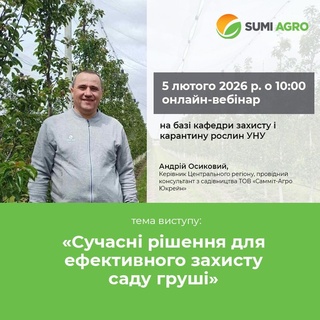 На базі кафедри захисту і карантину рослин Уманського національного університету 5 лютого 2026 р. о 10:00 відбудеться онлайн-вебінар на тему "Сучасні рішення для ефективного захисту саду груші"