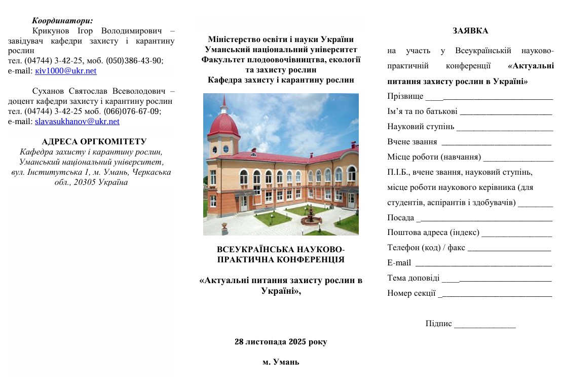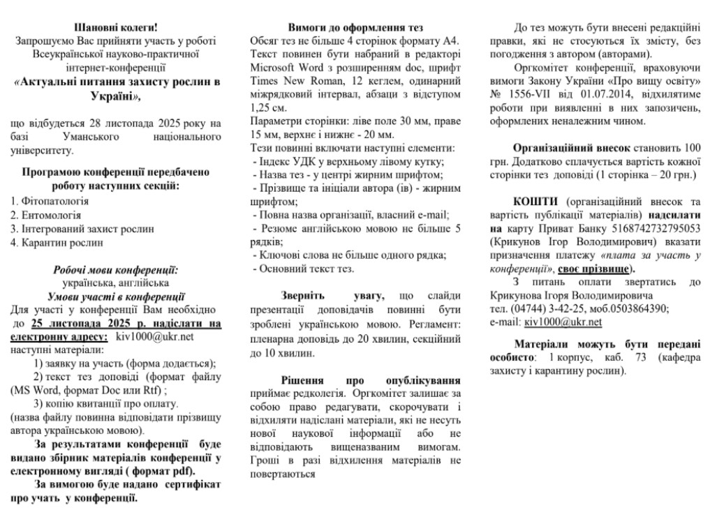 Остання редакція: 16 листопада 2025 ВСЕУКРАЇНСЬКА НАУКОВО- ПРАКТИЧНА КОНФЕРЕНЦІЯ «Актуальні питання захисту рослин в Україні»